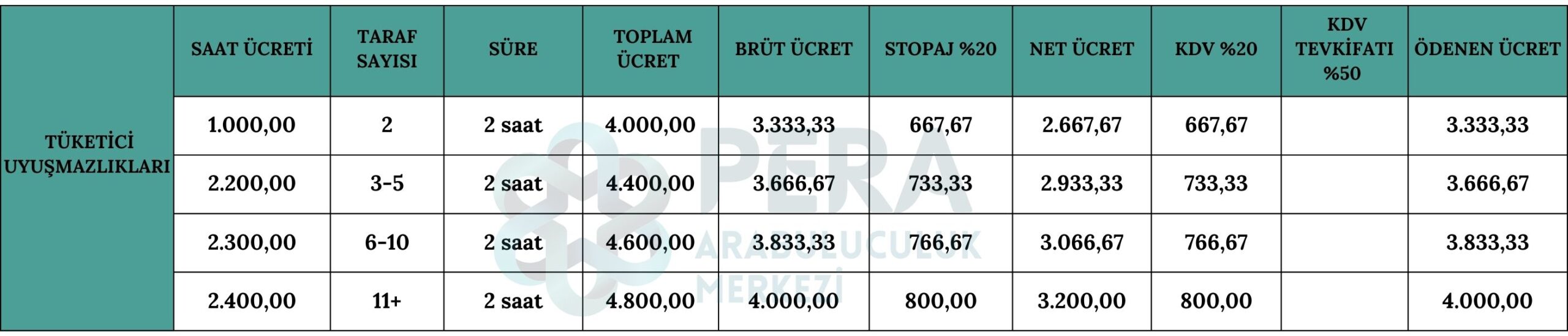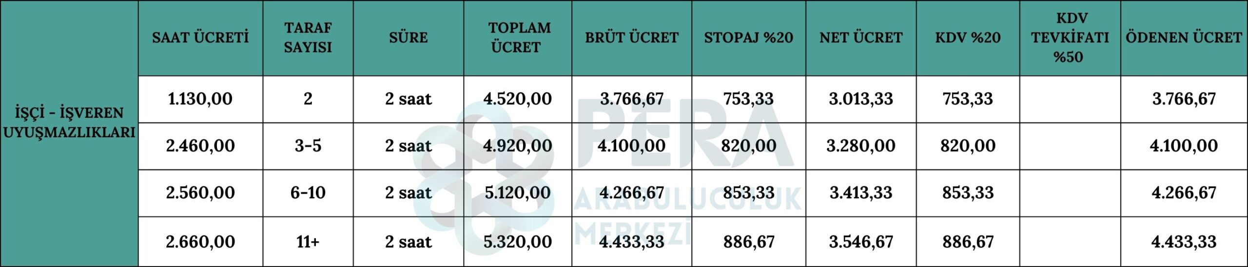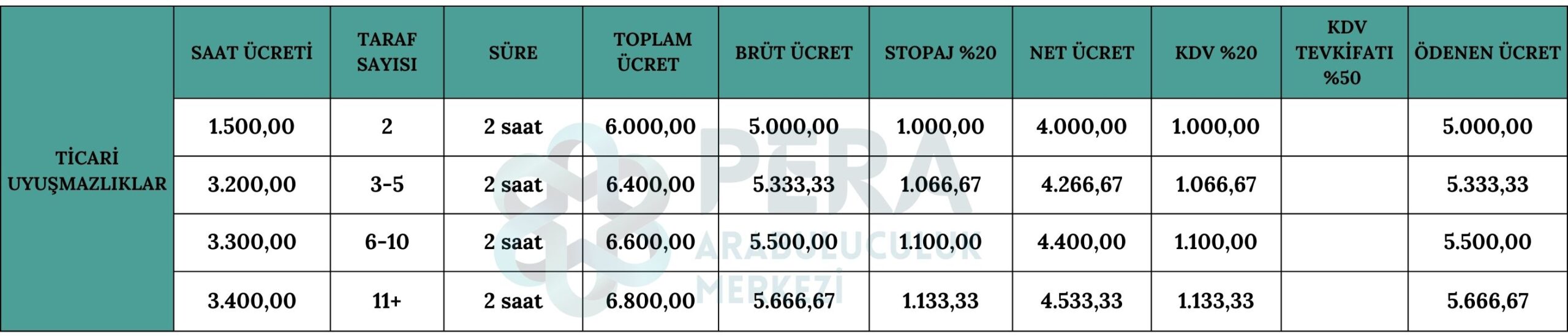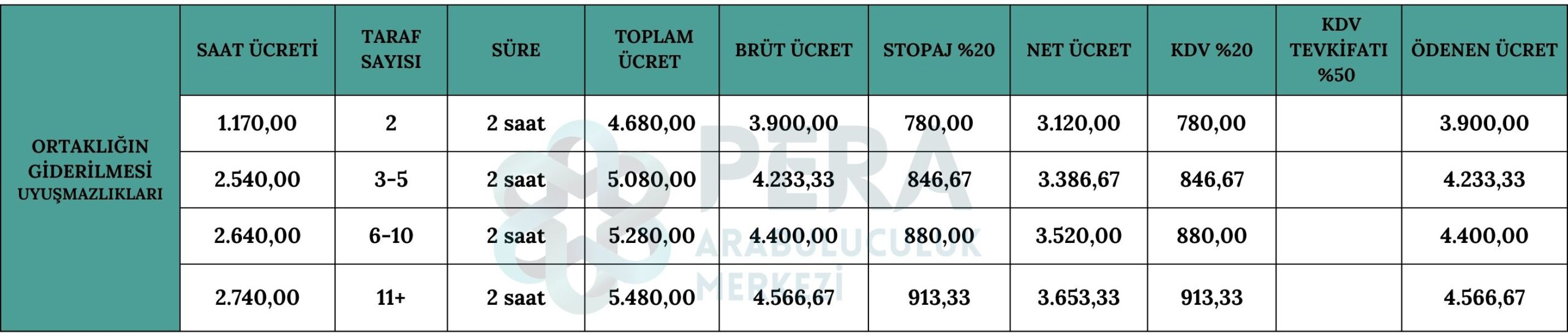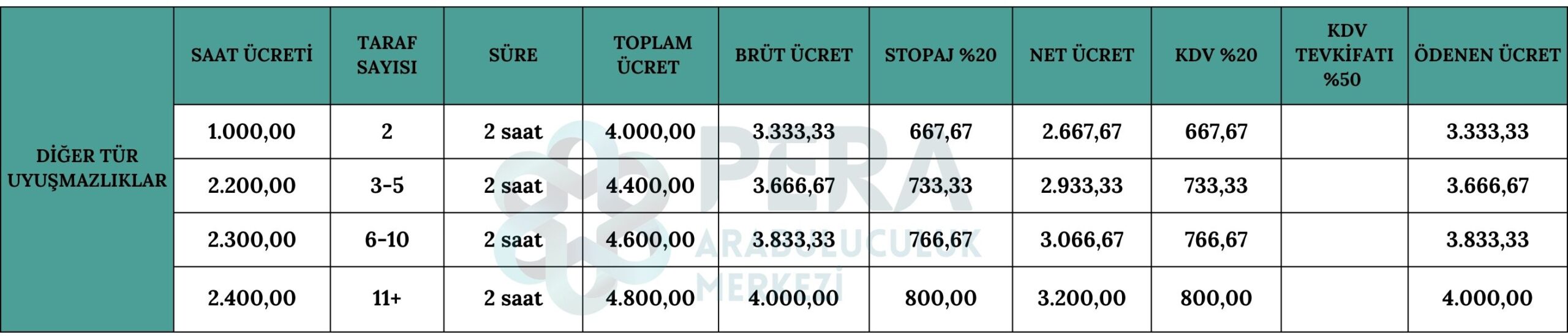 Önemli Not: 1 Mart 2021 tarihinde yürürlüğe giren, Katma Değer Vergisi Uygulama Genel Tebliği’ne göre Arabuluculuk hizmet bedelinin KDV dahil 2.000 TL’yi aşması halinde ve tebliğde belirtilen idare, kurum ve kuruluşlara makbuz kesilmesi halinde, 5/10 oranında KDV tevkifatı uygulanması gerekmektedir.