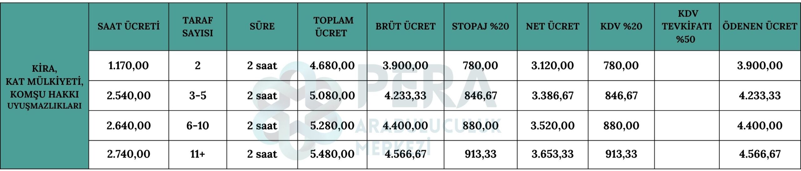 İcra ve İflas Kanunu İle Bazı Kanunlarda Değişiklik Yapılmasına Dair 7445 Sayılı Kanun ile dava şartı kapsamına alınan kira ilişkisinden kaynaklanan uyuşmazlıklar, taşınır ve taşınmazların paylaştırılmasına ve ortaklığın giderilmesine ilişkin uyuşmazlıklar, 23/6/1965 tarihli ve 634 sayılı Kat Mülkiyeti Kanunundan kaynaklanan uyuşmazlıklar ve komşu hakkından kaynaklanan uyuşmazlıklarda uygulanacak ücret tablosu.